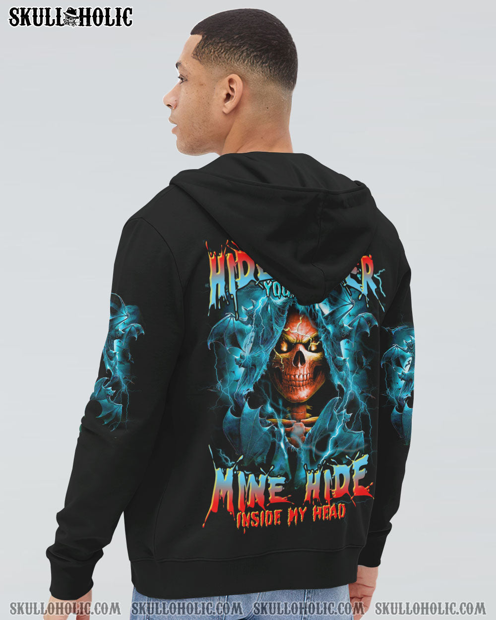 Unleash the dark side in you with our stunning design. An eye-catching reaper skull surrounded by bats and illuminated with flaming eyes and bright lightning bolts creates an electrifying aesthetic. The phrase “Your demons hide under your bed, Mine hide inside my head” is a reminder that everyone has their own inner demons to accept and overcome.Â